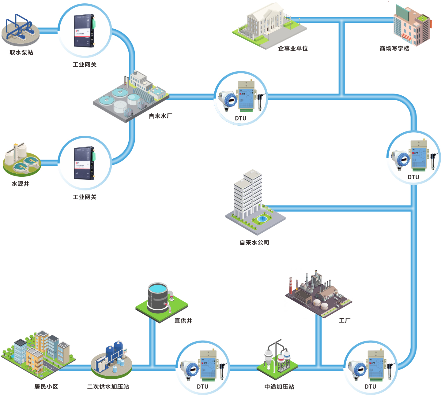 系統(tǒng)涵蓋城市供水中的水源地取水、水廠制水、管網(wǎng)輸水、加壓送水、用戶用水等各個環(huán)節(jié),實現(xiàn)全流程遠程監(jiān)管和智能聯(lián)動控制,優(yōu)化生產(chǎn)調(diào)度,保障高效供水,促進節(jié)能降耗,降低產(chǎn)銷差,是水司實現(xiàn)智慧化運營的重要途徑。