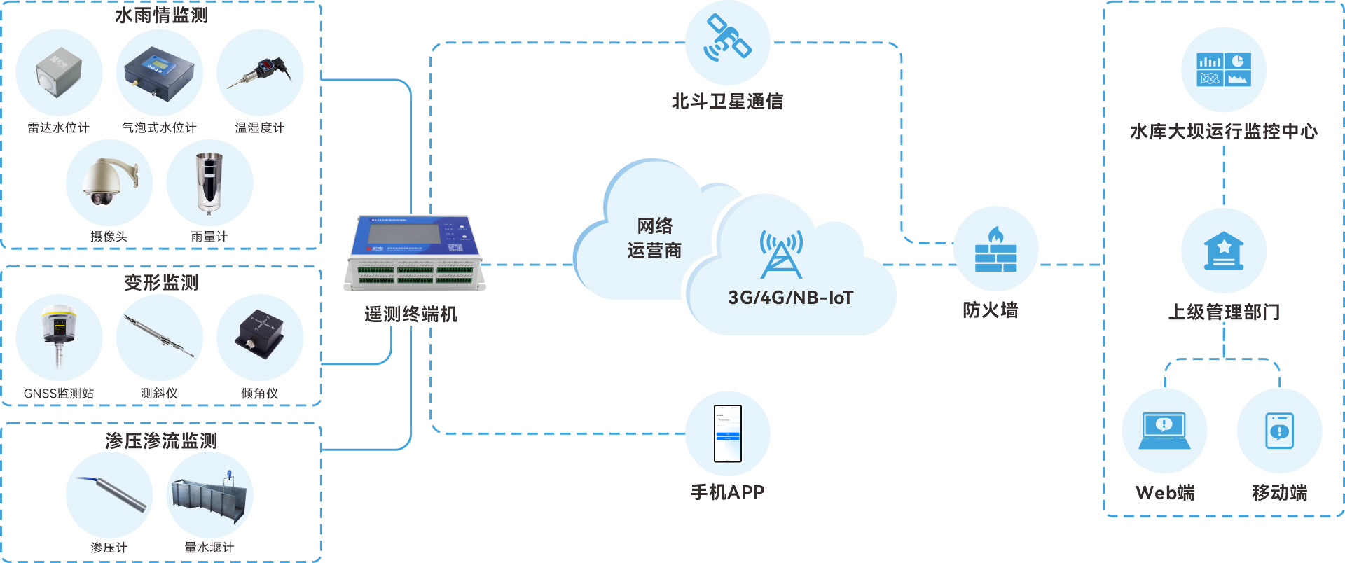 系統(tǒng)包含水庫雨水情監(jiān)測系統(tǒng)和大壩安全監(jiān)測自動化系統(tǒng)。水庫雨水情監(jiān)測系統(tǒng)以遙測終端為核心,配置翻斗式雨量計、雷達式或氣泡式水位計、攝像頭、電源系統(tǒng)、避雷系統(tǒng)以及相關的土建及附屬設施,實現(xiàn)雨水情信息的自動采集和自動傳輸。大壩安全監(jiān)測自動化系統(tǒng)可實現(xiàn)大壩表面變形監(jiān)測和滲流監(jiān)測。整個系統(tǒng)實現(xiàn)水庫大壩的全面感知監(jiān)測、綜合風險評估、科學輔助決策、智能分析預警、常態(tài)巡檢及預案管理等主要功能,助力水庫智慧化監(jiān)管。