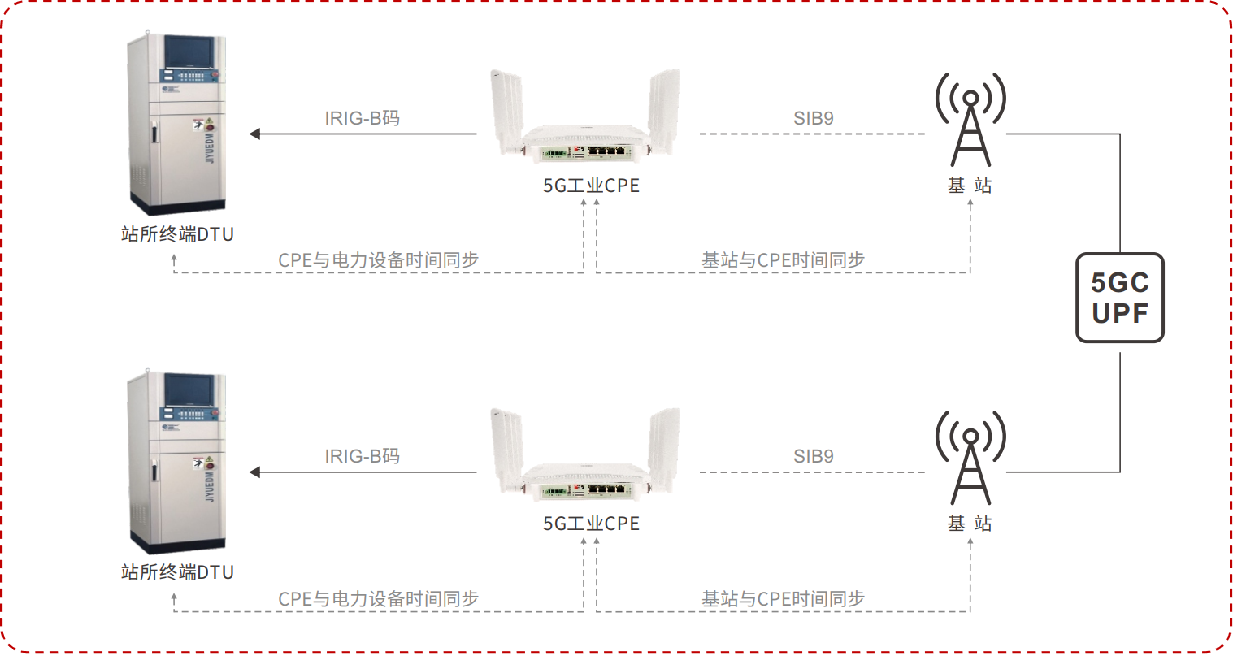 基于宏電5G工業(yè)智能網(wǎng)關(guān)/CPE的線路差動(dòng)保護(hù)解決方案通過在兩端的站所終端DTU上部署5G工業(yè)智能網(wǎng)關(guān)/CPE,構(gòu)建5G高速網(wǎng)絡(luò)實(shí)現(xiàn)終端間的互聯(lián)互通;5G基站通過GPS/北斗衛(wèi)星獲取精準(zhǔn)定時(shí),與標(biāo)準(zhǔn)時(shí)間進(jìn)行同步后,宏電5G工業(yè)智能網(wǎng)關(guān)/CPE通過空口SIB9消息獲取當(dāng)前精準(zhǔn)時(shí)鐘信息,再通過IRIG-B碼的方式脈沖到站所終端DTU,站所終端DTU在接收到數(shù)據(jù)后解析B碼信息,獲取標(biāo)準(zhǔn)時(shí)間,從而實(shí)現(xiàn)各裝置之間以及現(xiàn)場(chǎng)裝置與主站間的時(shí)鐘同步,實(shí)現(xiàn)點(diǎn)對(duì)點(diǎn)快速傳輸,完成故障自愈。