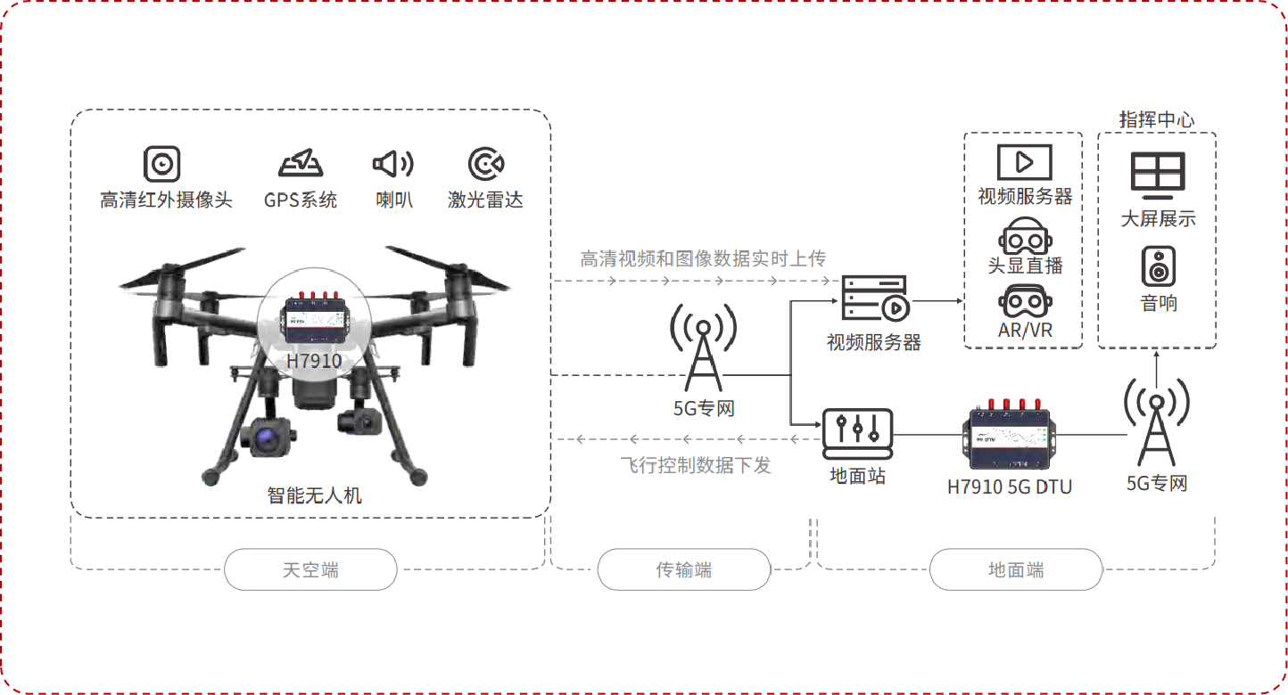宏電輸電線(xiàn)路無(wú)人機(jī)巡檢解決方案將宏電5G DTU內(nèi)置于巡檢無(wú)人機(jī)內(nèi),通過(guò)網(wǎng)口連接無(wú)人機(jī)攝像頭,實(shí)時(shí)將無(wú)人機(jī)拍攝的輸電線(xiàn)路圖像、視頻等數(shù)據(jù)上傳到視頻服務(wù)器和數(shù)據(jù)服務(wù)器,地面端通過(guò)宏電5G DTU與天空端進(jìn)行數(shù)據(jù)交互,把數(shù)據(jù)服務(wù)器上的無(wú)人機(jī)拍攝的畫(huà)面調(diào)取到大屏上,便于地面指揮中心及時(shí)了解線(xiàn)路狀況,進(jìn)行故障預(yù)警和應(yīng)急處理。
