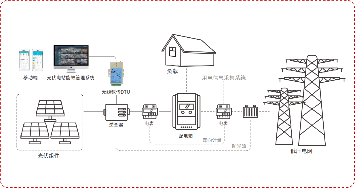 通過宏電無線數傳終端采集逆變器、匯流箱、儲能站、輻照儀、氣象儀、電表等各類數據,并通過3G/4G/5G/RedCap網絡上傳至光伏電站能效管理系統(tǒng)進行數據統(tǒng)計分析與展示,實現分布式光伏場站的透明化管理、自動化運維。