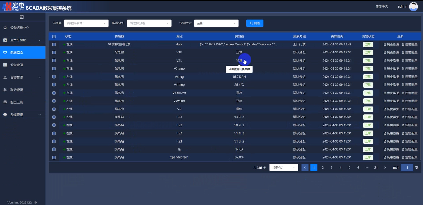 可視化主要通過宏電SCADA組態(tài)工具提供各種儀表盤、圖表等可視化界面,實(shí)時(shí)顯示各種參數(shù)和數(shù)據(jù),同時(shí)提供趨勢(shì)分析、統(tǒng)計(jì)分析、歷史數(shù)據(jù)記錄等功能,以便實(shí)現(xiàn)對(duì)工藝過程的可視化管理和優(yōu)化。