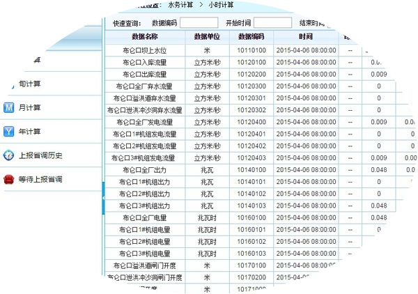 水務(wù)計(jì)算主要提供對(duì)接入平臺(tái)數(shù)據(jù)進(jìn)行計(jì)算,達(dá)到上報(bào)省調(diào)數(shù)據(jù)標(biāo)準(zhǔn)要求的功能。通過(guò)列表將數(shù)據(jù)進(jìn)行分段展示,同時(shí)顯示平臺(tái)待上報(bào)和已上報(bào)省調(diào)的數(shù)據(jù)。