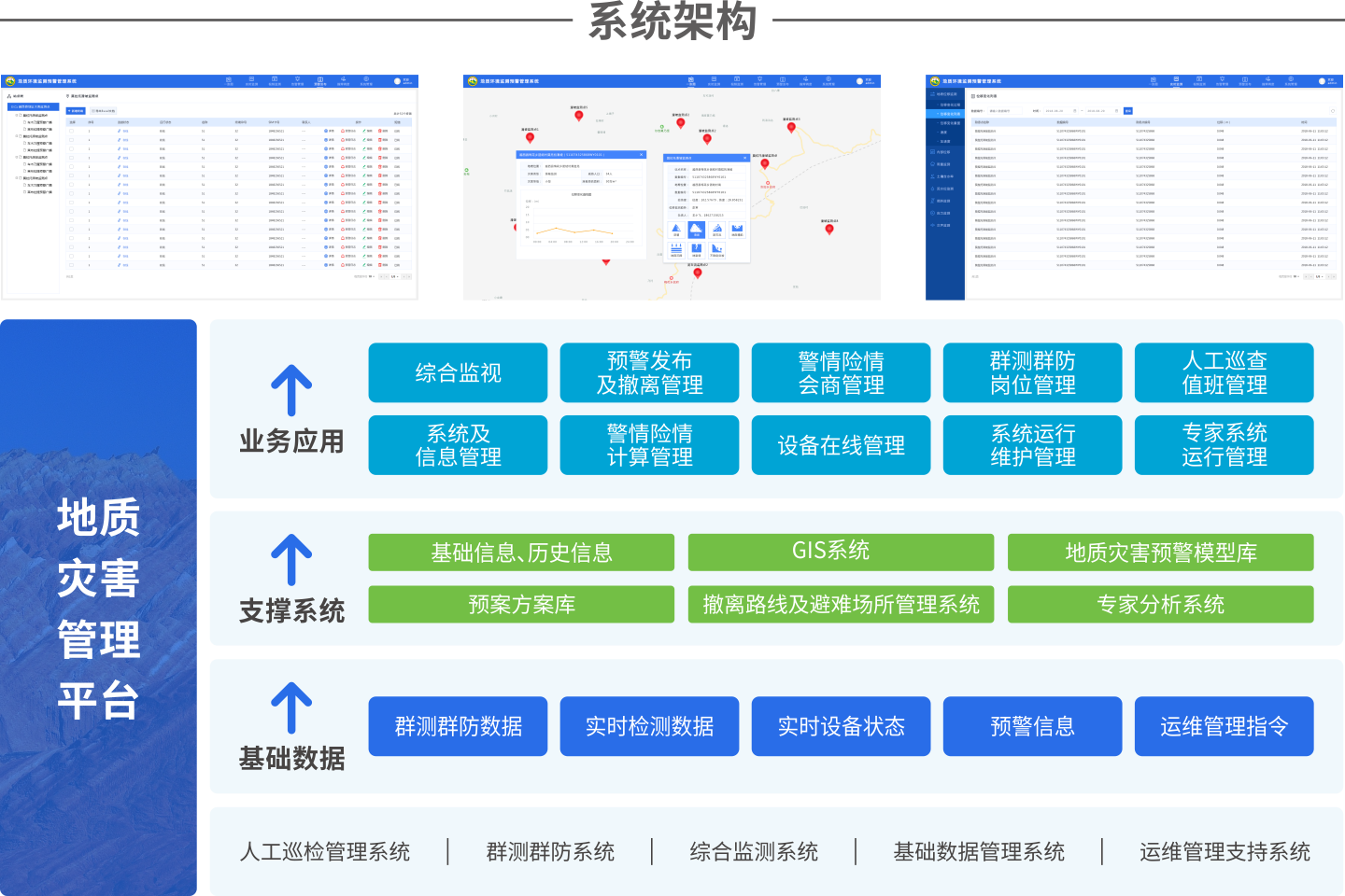 災(zāi)害預(yù)報(bào)預(yù)警系統(tǒng)實(shí)現(xiàn)對地質(zhì)災(zāi)害監(jiān)測預(yù)警預(yù)報(bào)過程中管理與決策,是地質(zhì)災(zāi)害監(jiān)測預(yù)警可視化基礎(chǔ)平臺。包括災(zāi)害點(diǎn)查詢、數(shù)據(jù)綜合分析、輔助決策、自動(dòng)通告報(bào)警、災(zāi)情上報(bào)及信息發(fā)布、易發(fā)及預(yù)警分析,系統(tǒng)支持無人值守、自動(dòng)預(yù)警預(yù)報(bào)、自動(dòng)補(bǔ)漏,能及時(shí)進(jìn)行滑坡、崩塌變形破壞預(yù)報(bào)和泥石流發(fā)生、發(fā)展、爆發(fā)預(yù)報(bào),并自動(dòng)向地質(zhì)災(zāi)害隱患點(diǎn)監(jiān)測人、監(jiān)測責(zé)任人、防災(zāi)責(zé)任人發(fā)送預(yù)警短信,為地質(zhì)災(zāi)害防災(zāi)、減災(zāi)工作爭取時(shí)間。